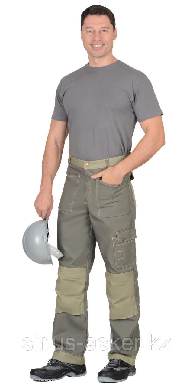 Брюки с притачным поясом, застегивающимся на джинсовую пуговицу и с регулировкой ширины пояса при помощи пат и кнопок, с накладными карманами и объемными наколенниками с возможностью вставить в них объемные щитки